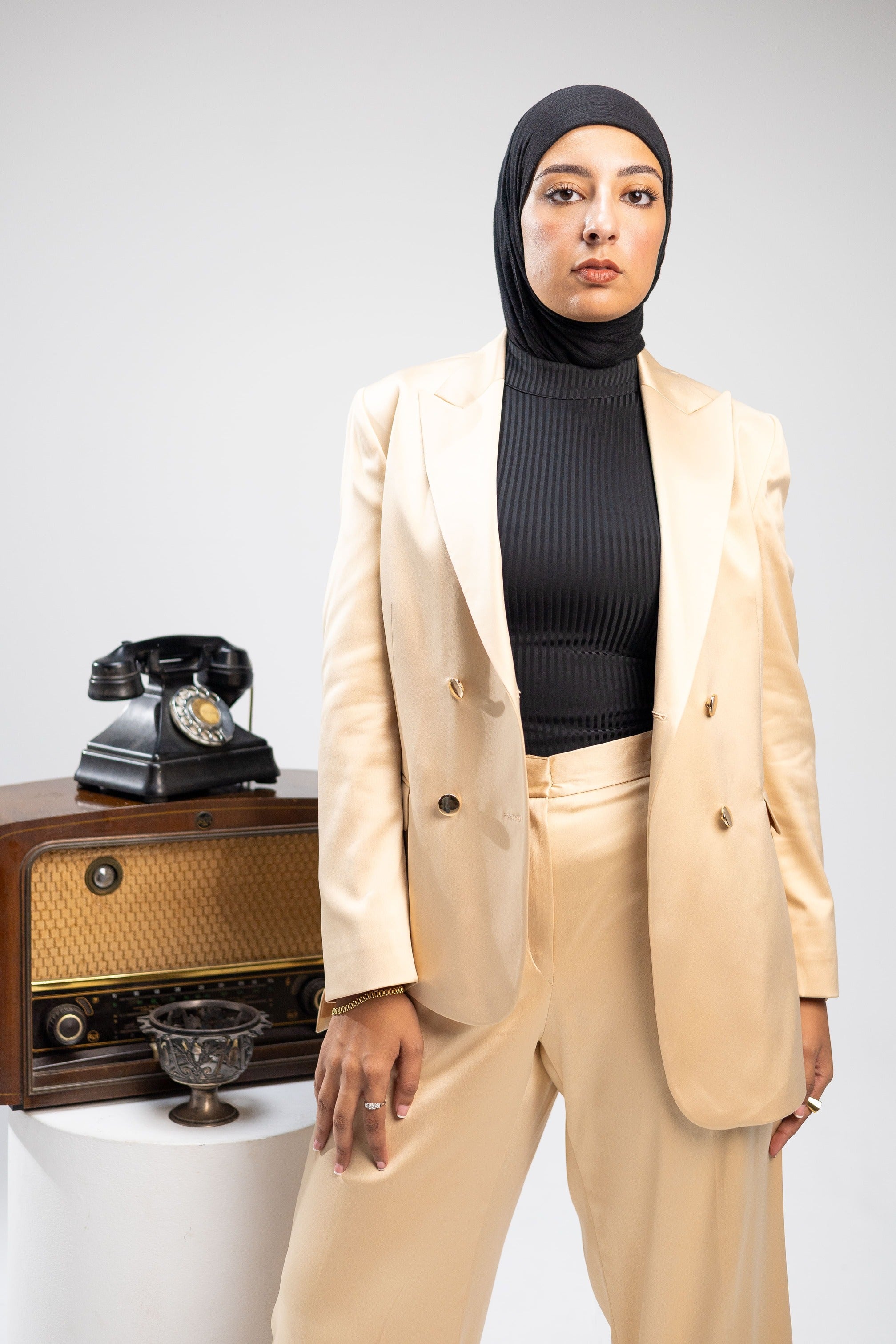 A sharply tailored blazer featuring structured shoulders, a classic notched lapel, and a fully functional double-breasted closure. The back is finished with a decorative lace-up detail at the waist, corset-inspired yet purely aesthetic, designed to define the waist without altering the blazer’s structure.