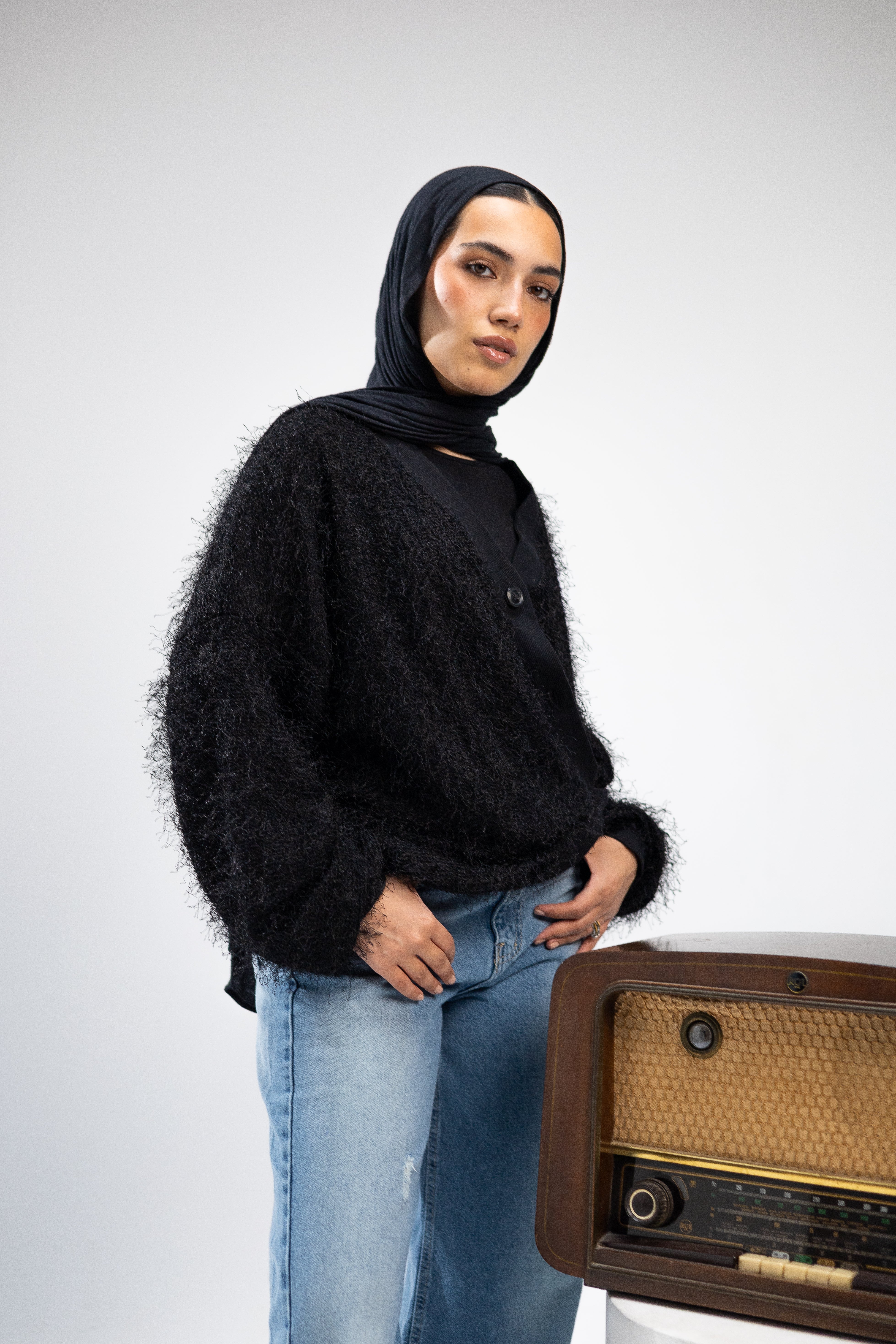 A versatile mohair cardigan designed to be worn two ways. Style it open for a relaxed look, or use the side button to create a wrapped, asymmetrical silhouette.
